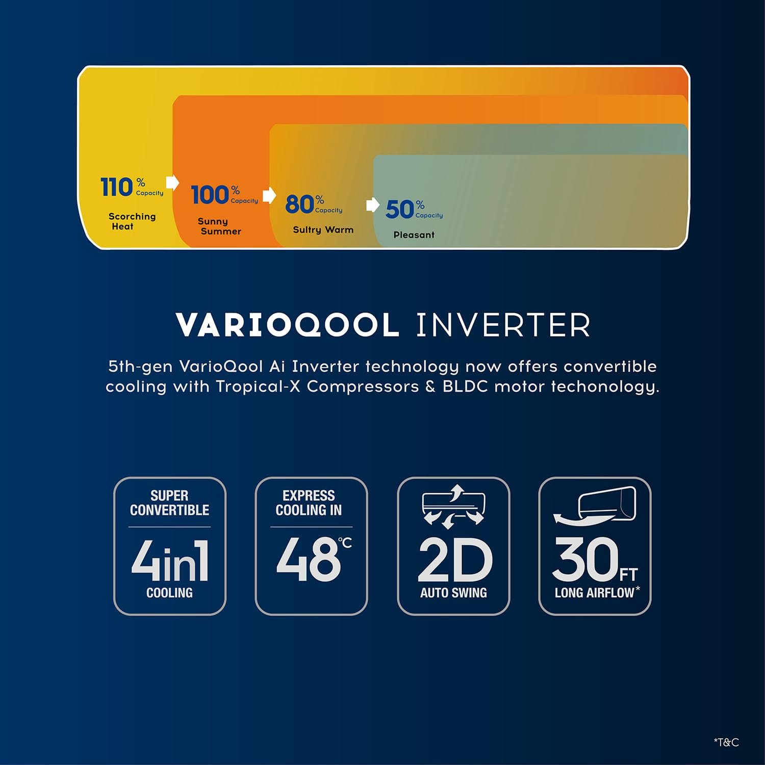 - Split AC with inverter compressor: Variable tonnage technology for faster cooling that adjusts power depending on cooling requirement.
