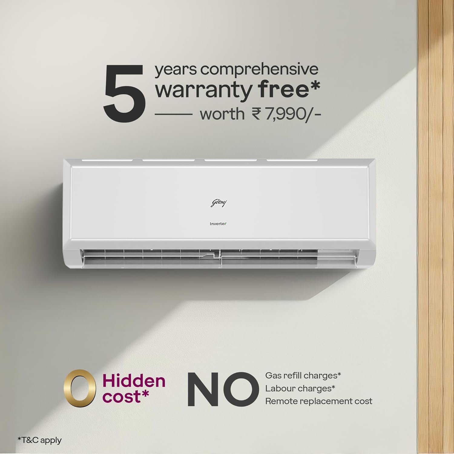 - Manufacturer Warranty: 5 YEARS FREE COMPREHENSIVE WARRANTY, applicable on purchase after 1st Sept 2024 (Coverage: Labor and all functional parts: Gas charging, compressor, Inverter controller drive, Remote, Indoor PCB, Fan Motors, Heat Exchange coils), 5 years on PCB, 10 years on compressor
